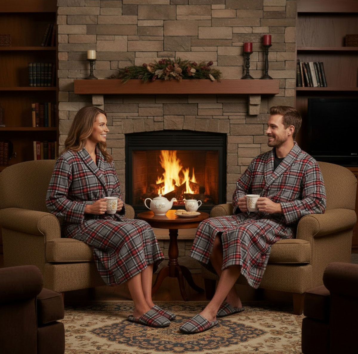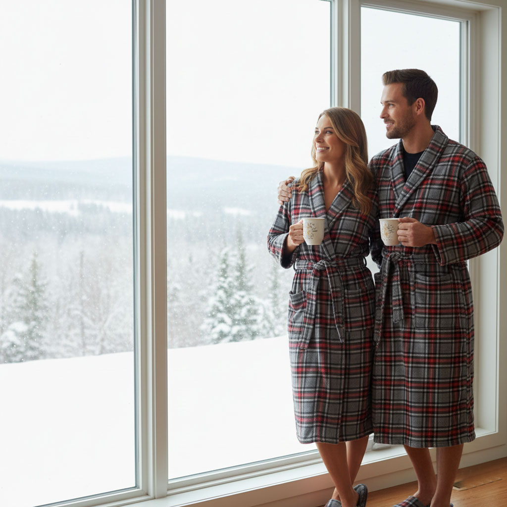 Мъжки домашен халат от полар - топъл и мек. Ушит от плат, който запазва телесната топлина. Цветовете са класическа комбинация - бордо, сиво, бяло, на сива основа. Изискван и подходящ и за мъже, и за жени.