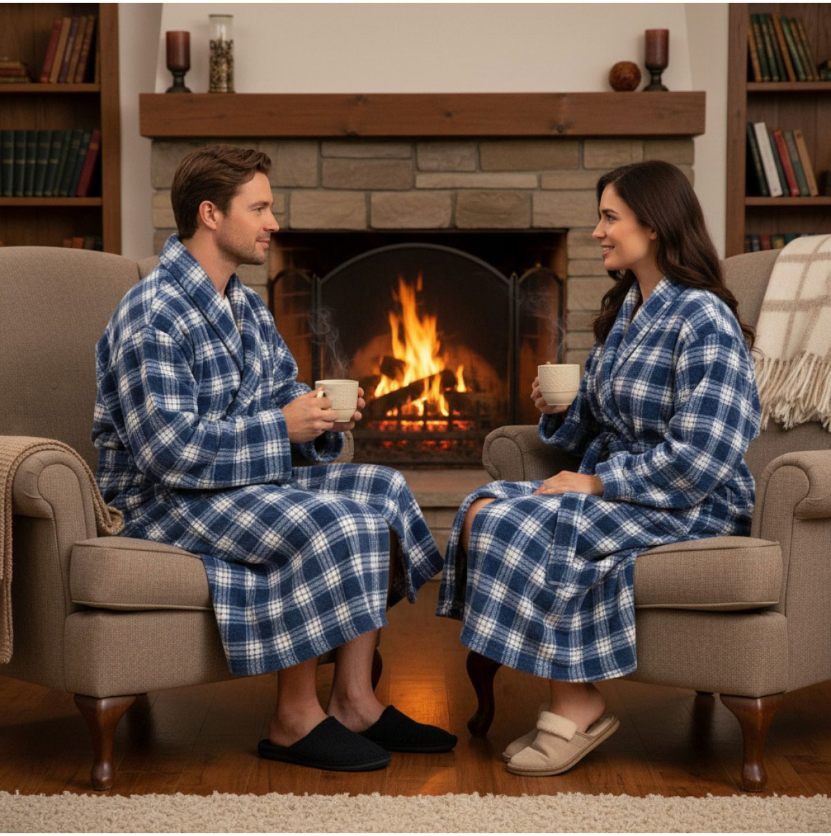 По отношение на интериора, този десен се съчетава прекрасно с плътни завеси в тъмносиньо, графитено или топли земни тонове, с дървени мебели и текстилни аксесоари като одеяла и декоративни възглавници. В интериори с камина, естествено дърво и неутрални цветове халатът допълва атмосферата на уют и релакс.