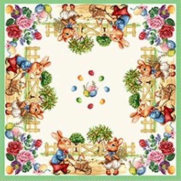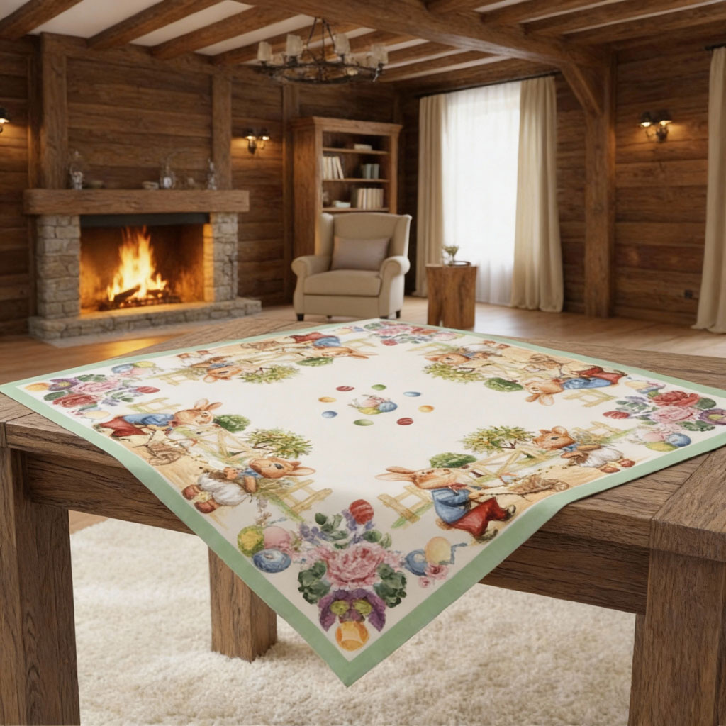 Илюстрациите на работливи зайчета, кошници с яйца, цветя и пролетни мотиви са изпълнени в мека цветова гама – зелено, пастелни розови и естествени тонове, които се съчетават отлично с дървени маси, светли интериори. Жакардовият плат придава релеф и текстура. Карето е устойчиво във времето и подходящо за многократна употреба през празничните сезони.