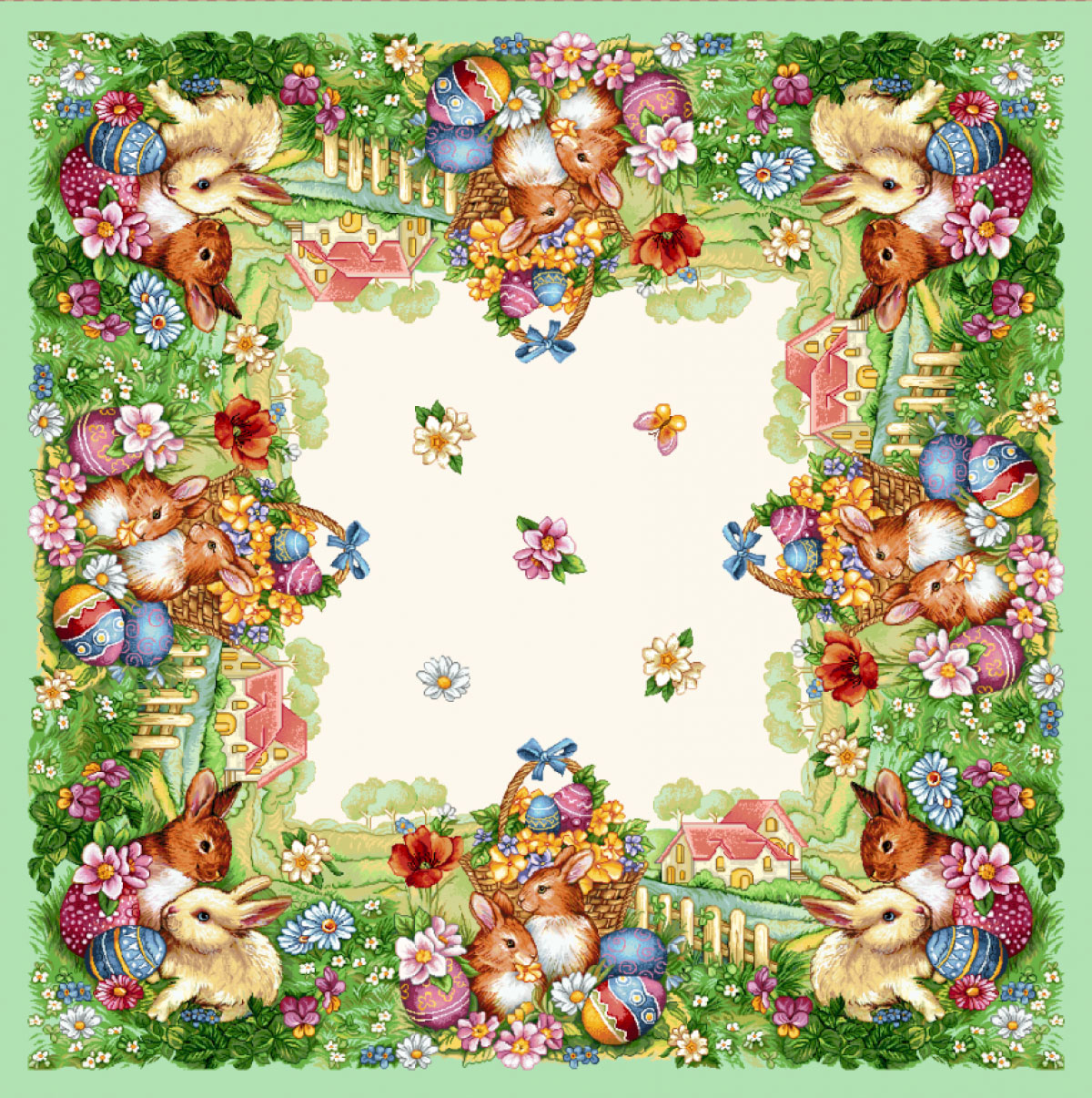 Великденската композиция включва зайчета, кошници с яйца и пролетни цветя, разположени като широк бордюр. Централната част позволява удобно сервиране и подреждане на масата. Това оформление прави продукта подходящ както за декоративна, така и за практическа употреба.