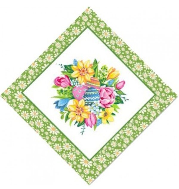 Декоративната жакардова салфетка - великденско каре с размер 45×45 см е фин празничен акцент. Великденски венец е съчетан с нежни пролетни цветя и пъстри яйца в меки, пастелни тонове. Зеленият бордюр с маргаритки създава усещане за свежест и връзка с природата.