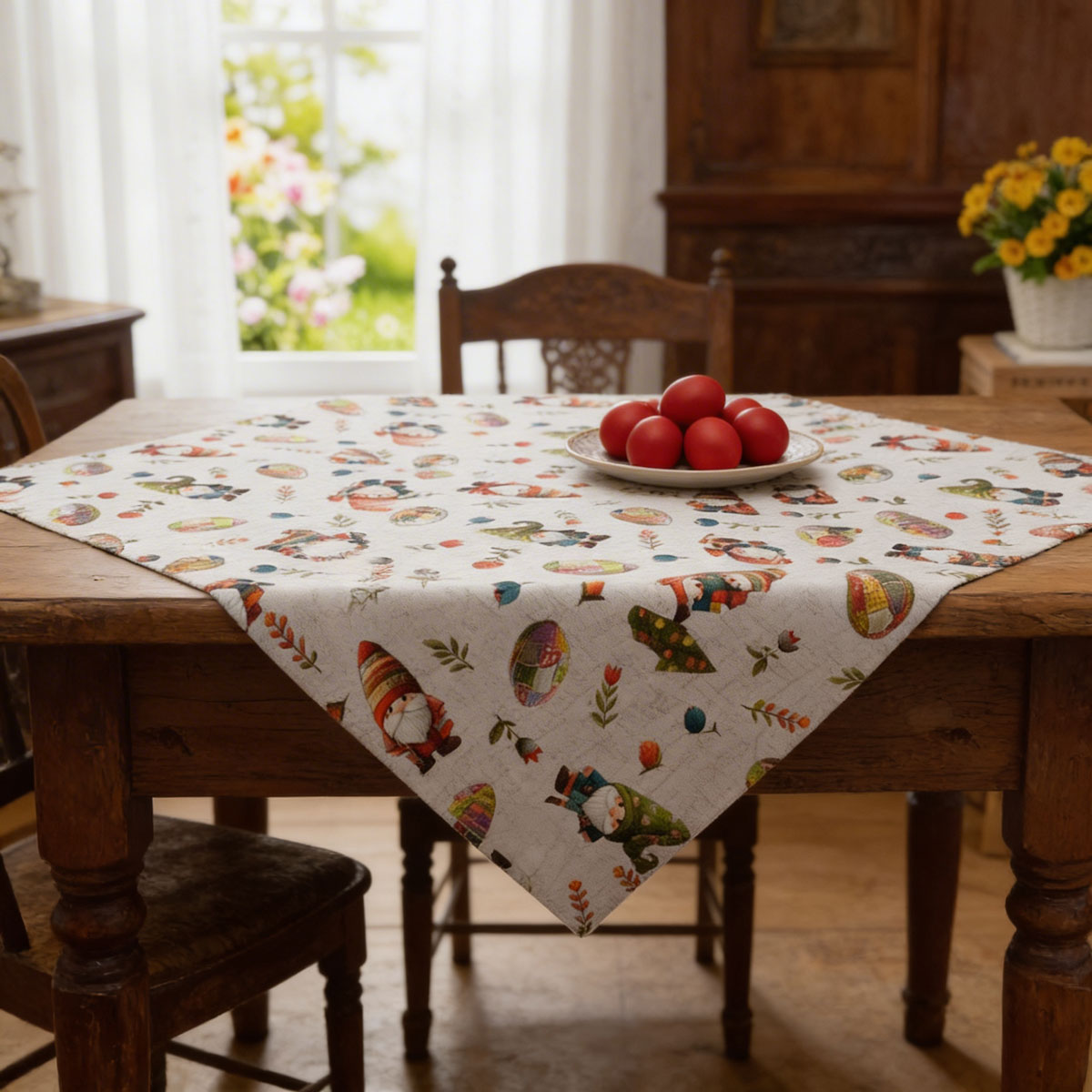 Класическото великденско каре 90×90 см - празникът се усеща чрез детайла. Дизайнът комбинира традиционни великденски елементи – фигури на джуджета и тематични символи, поднесени с мярка и хармония. Цветовете са топли и балансирани.