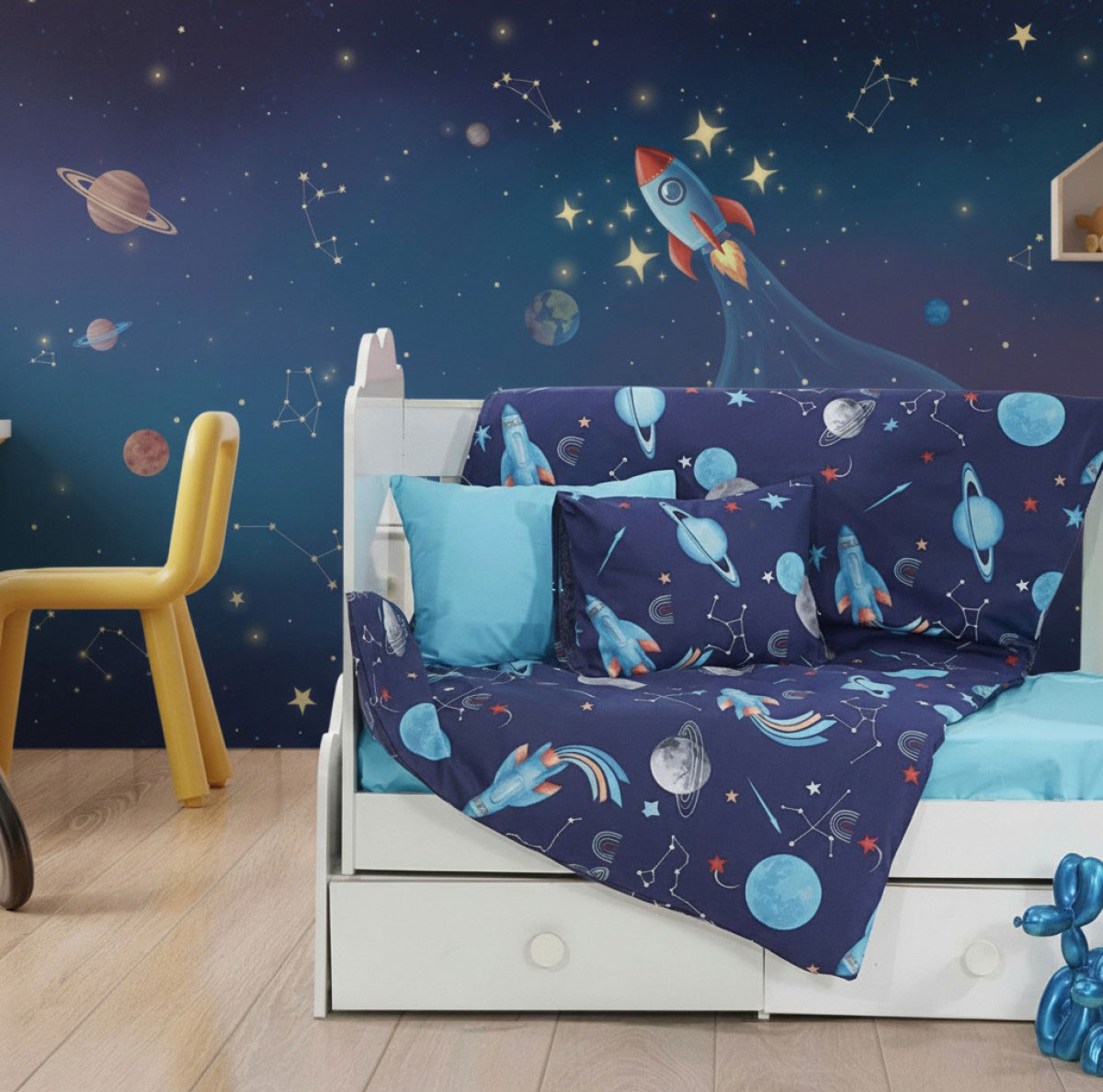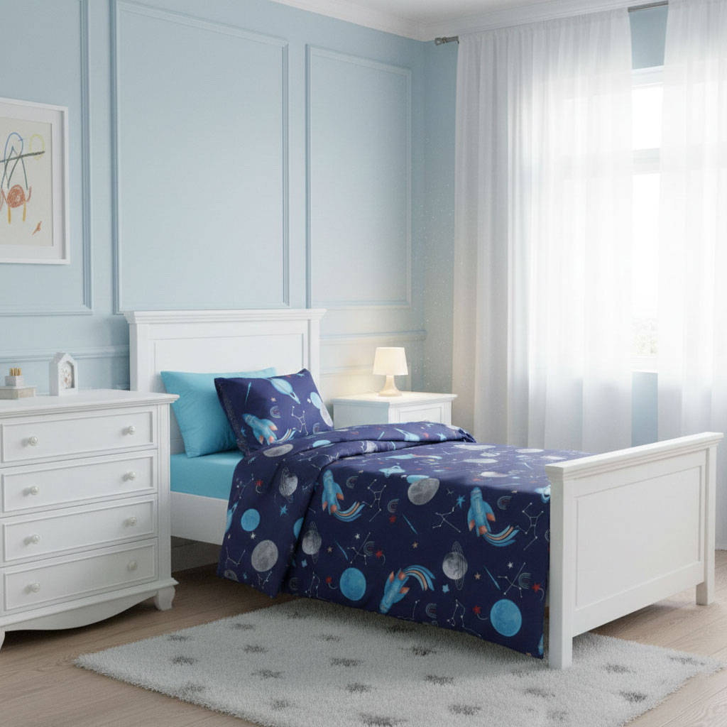 практичност и въображение в едно. Тъмносиният фон, осеян с ракети, планети и съзвездия, създава усещане за нощно небе и превръща детската стая в малка обсерватория на мечтите. Това е среда за вдъхновение.