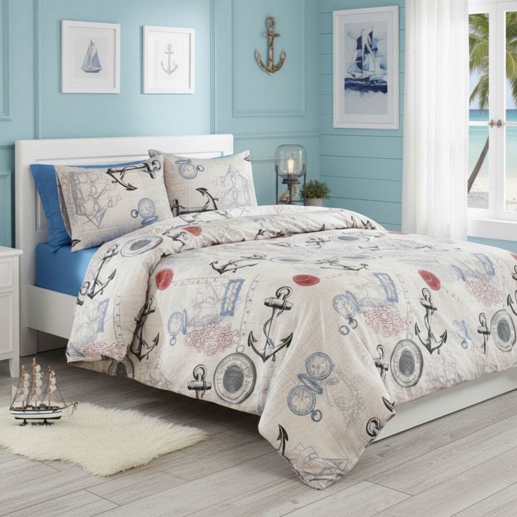 „Морско приключение с котви“ е детски спален комплект от ранфорс, вдъхновен от света на морските пътешествията. Десенът е с котвии тематини фигури. Цветовата комбинация носи усещане за стабилност и динамика едновременно. Това е дизайн, който създава характерна, тематична детска стая без да бъде натрапчив.