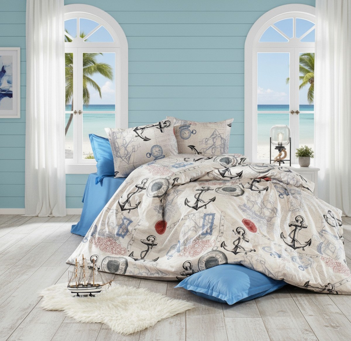 Комплектът е идеален за детски стаи в морски стил, скандинавски интериори или стаи с бели мебели и светлосини стени. Комбинира се отлично с: