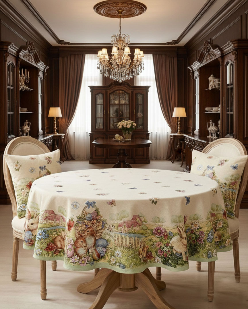 Тази жакардова великденска покривка Ф160 превръща масата в пролетна сцена – с фино изтъкани зайчета, цветя и пасторални мотиви, подредени като илюстрация от стара детска книга.