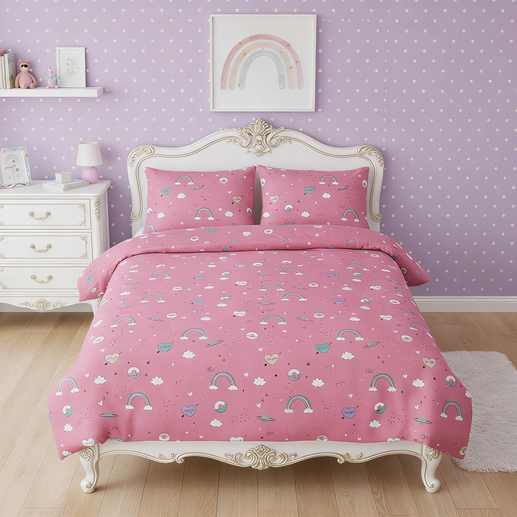 Детска олекотена завивка за момиченце. Розово-цикламени цветове отвеждат малките дами в един прекрасен Розов свят. Десенът е приказен, рисунките много меки и изящни. Спално бельо за деца от фин памук. Запазва цветове и форма.