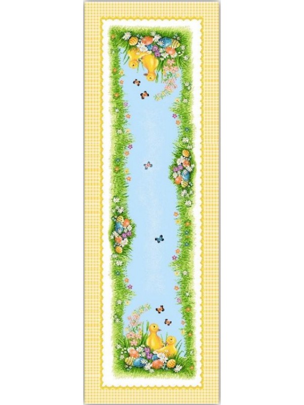 Този великденски тишлайфер съчетава класическа композиция с мека пролетна цветова палитра. Светлосиният централен панел носи лекота и въздух. Треви, цветя и яйца създават естествена декоративна рамка по дължината на масата. Малките патенца в краищата добавят деликатен празничен акцент, без да правят дизайна детски или натрапчив.