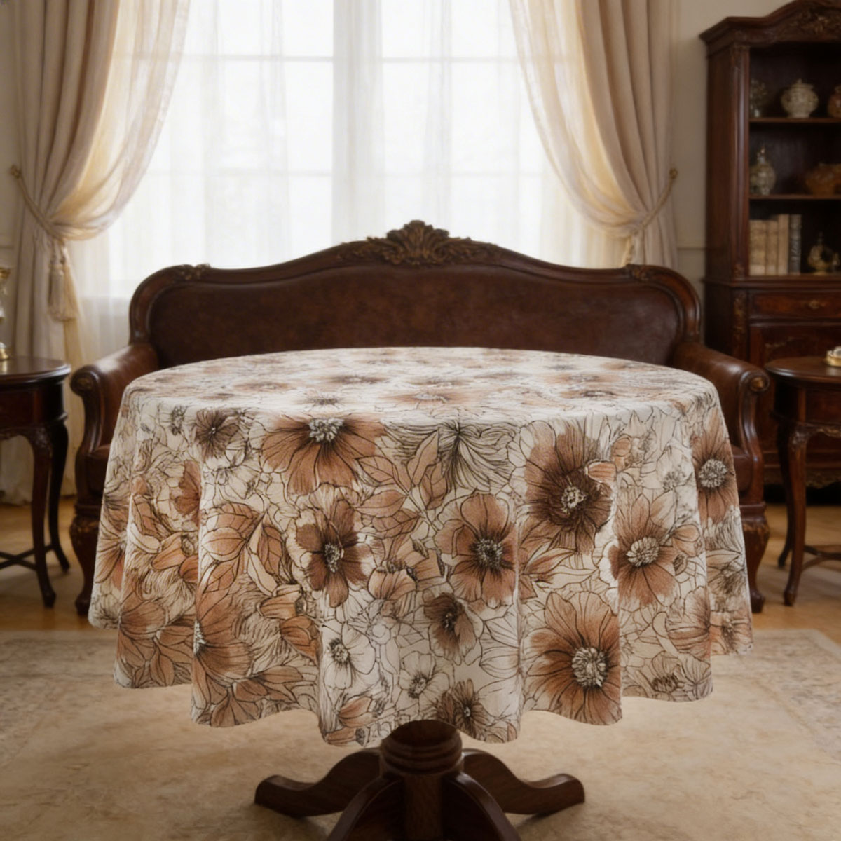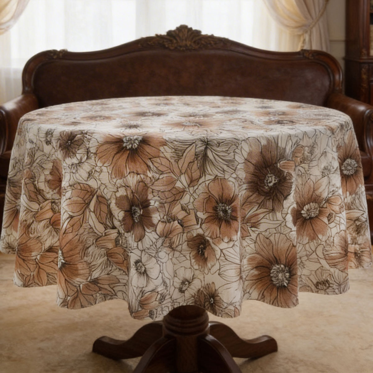 Тази покривка за маса е с богат десен, вдъхновен от естествените земни нюанси. Едри цветове са изобразени в карамелено кафяво, топъл беж и деликатни кремави тонове. Фините контури на листата и цветните венчелистчета създават усещане за дълбочина и мек художествен ефект.