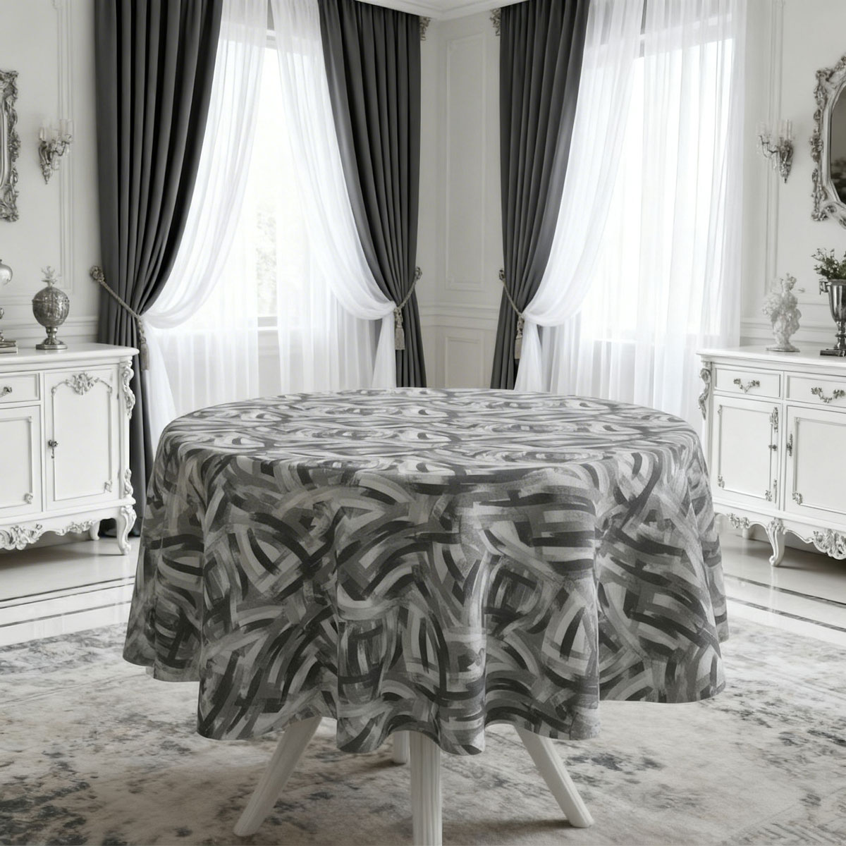 Тази покривка за маса привлича с динамичен абстрактен десен, изграден от плавни линии и преливащи се сиви тонове. Дизайнът съчетава абстрактна геометрия и артистична текстура, което създава усещане за движение и визуална дълбочина. Нюансите на светлосиво, графитено и антрацит се комбинират хармонично, което прави покривката лесна за съчетаване с различни мебели и интериорни стилове.