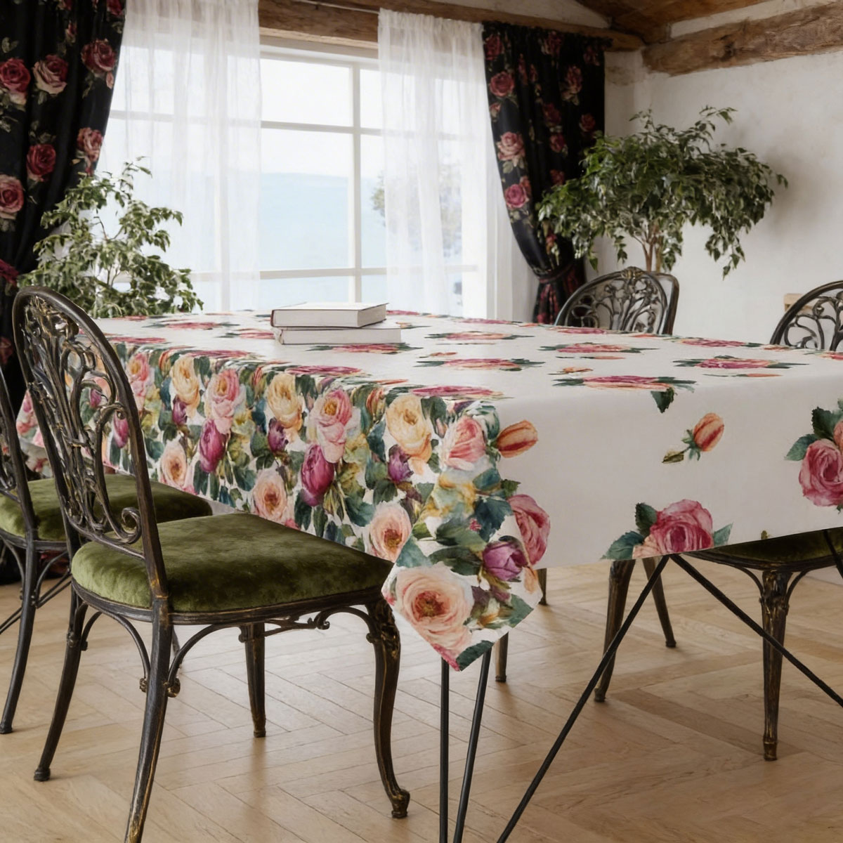 Светлият фон подчертава цветовете и придава лекота на дизайна.Розите носят усещане за природна свежест и домашен уют. Това прави покривката прекрасен избор за пространства, в които се търси топла и приветлива атмосфера.