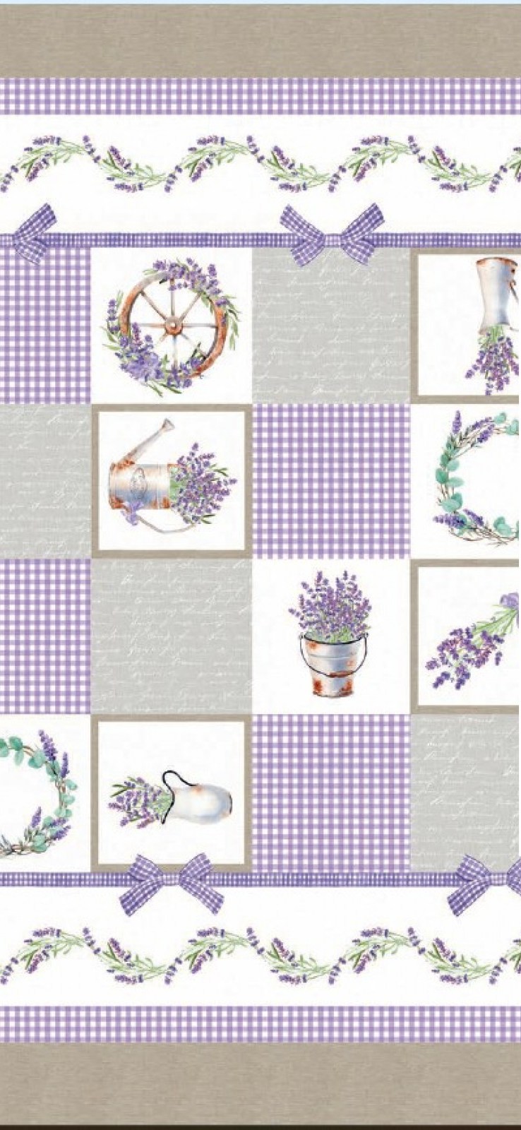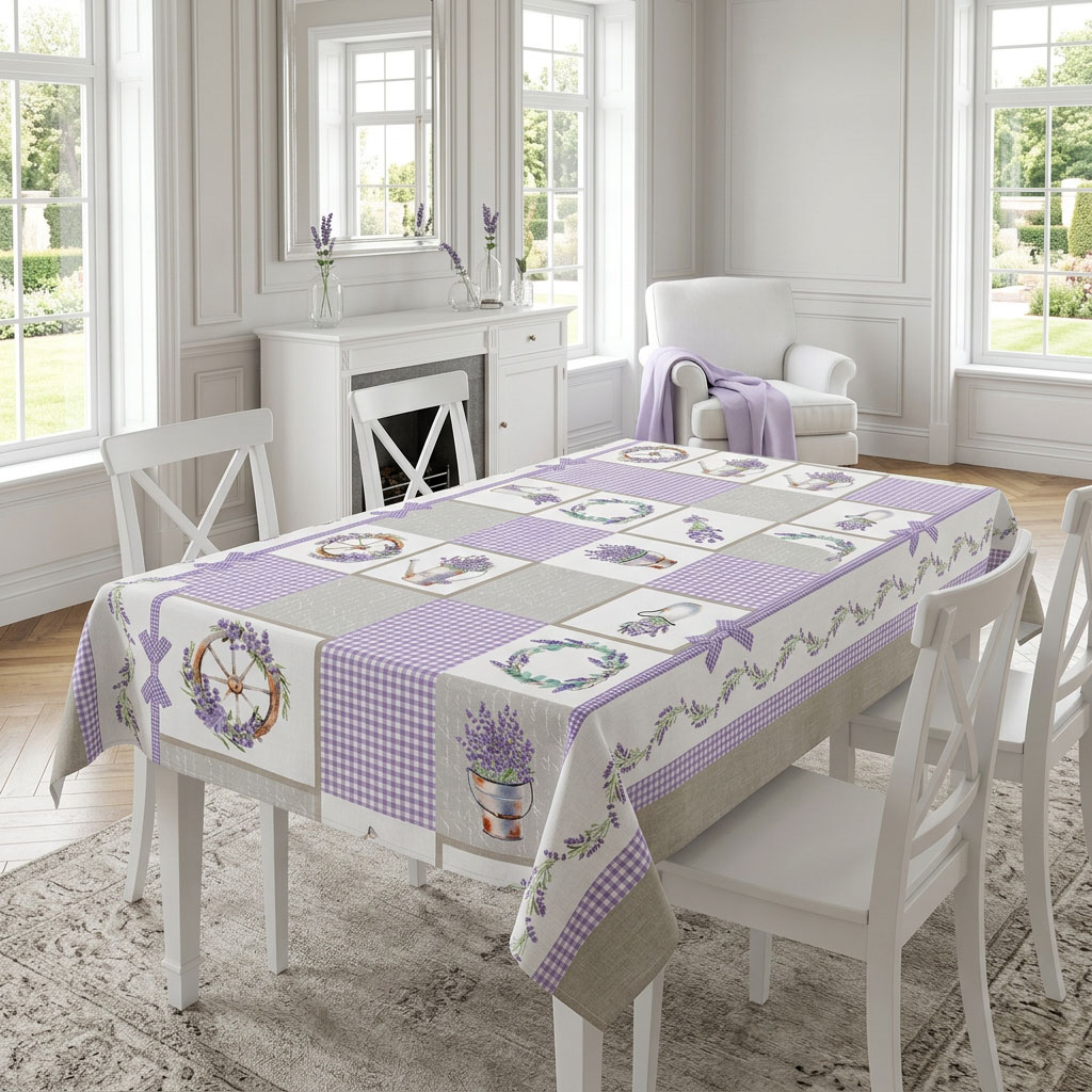 Тази покривка за маса е вдъхновена от спокойствието и романтиката на южна Франция. Десенът комбинира деликатни лавандулови клонки, декоративни панделки и характерно каре в мек лилав тон. Композицията напомня за малки градински детайли – лейка, колело и кошнички с ароматна лавандула – които създават усещане за уютна селска градина.