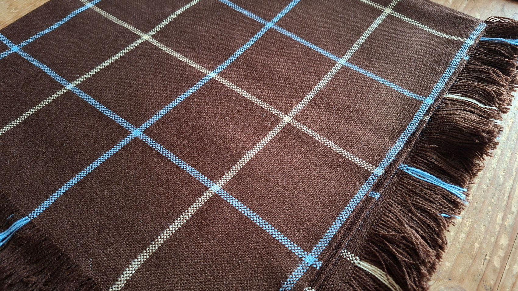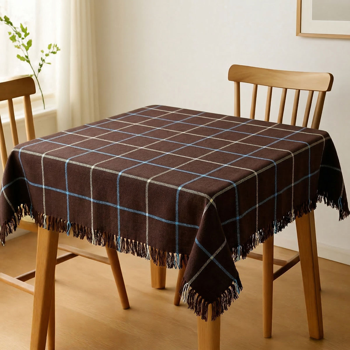 Битова покривка за маса в кафяво каре и тънки сини и бежови линии балансира между земни нюанси и класически десен. Наситената кафява основа създава усещане за стабилност, топлина и домашен комфорт. Карето в синьо и бежово внася ритъм, свежест и визуална лекота. Ресните допълват цялостната визия с мек декоративен акцент.