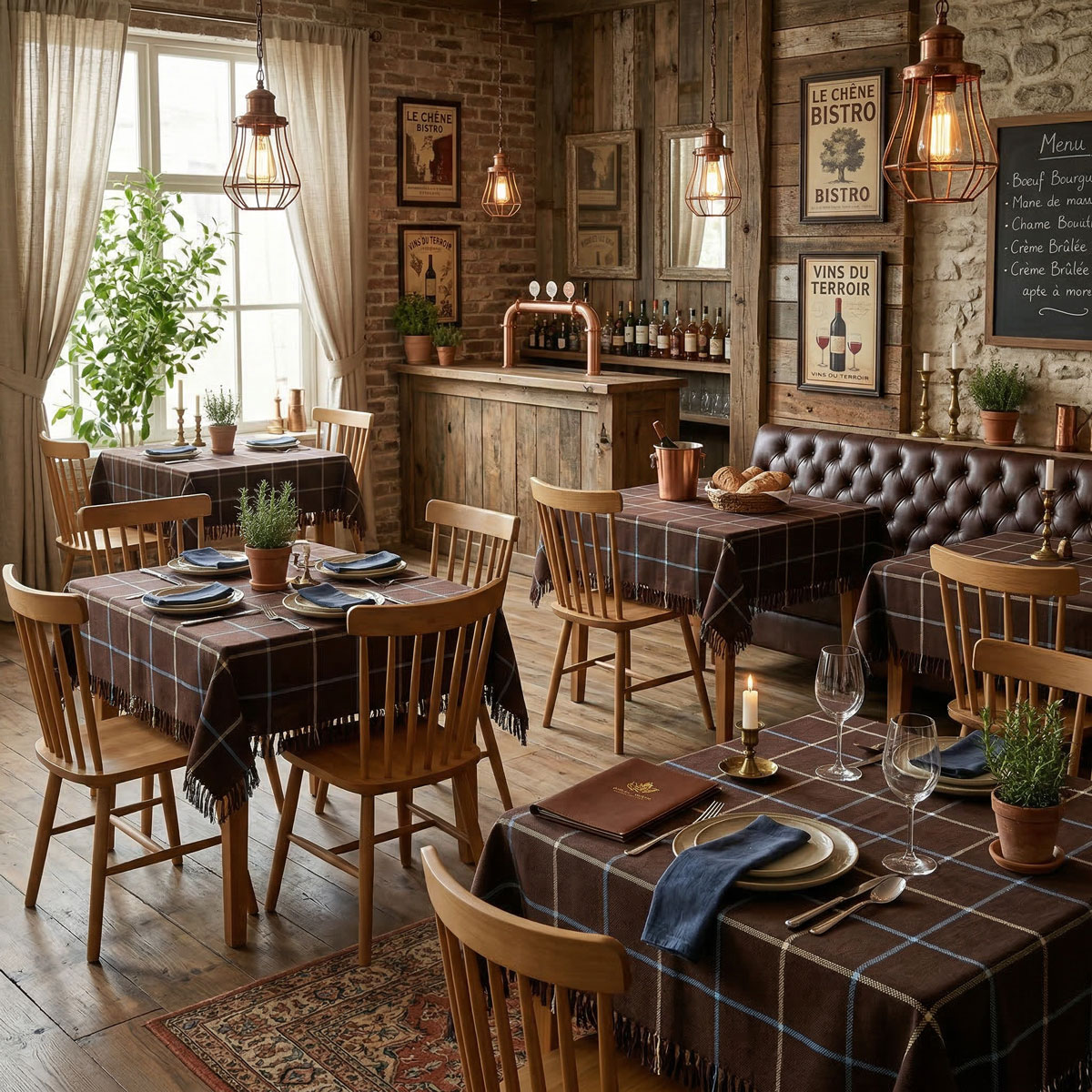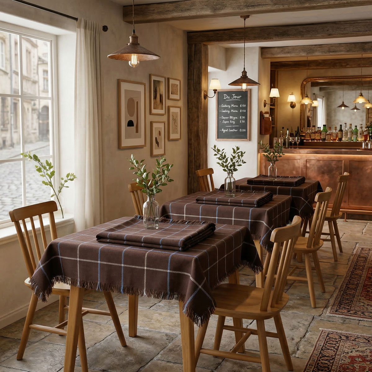За заведения тази покривка е много добър избор за механи, бистра, семейни ресторанти, къщи за гости, винарни, хижи и места с домашна кухня, където се търси автентичност и уют. Кафявият тон изглежда топъл и спокоен, а сините линии добавят фин акцент, който прави масата по-интересна и по-запомняща се. Това е покривка, която не просто покрива масата, а участва активно в изграждането на атмосфера.