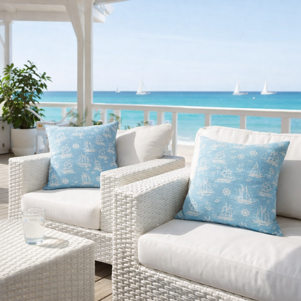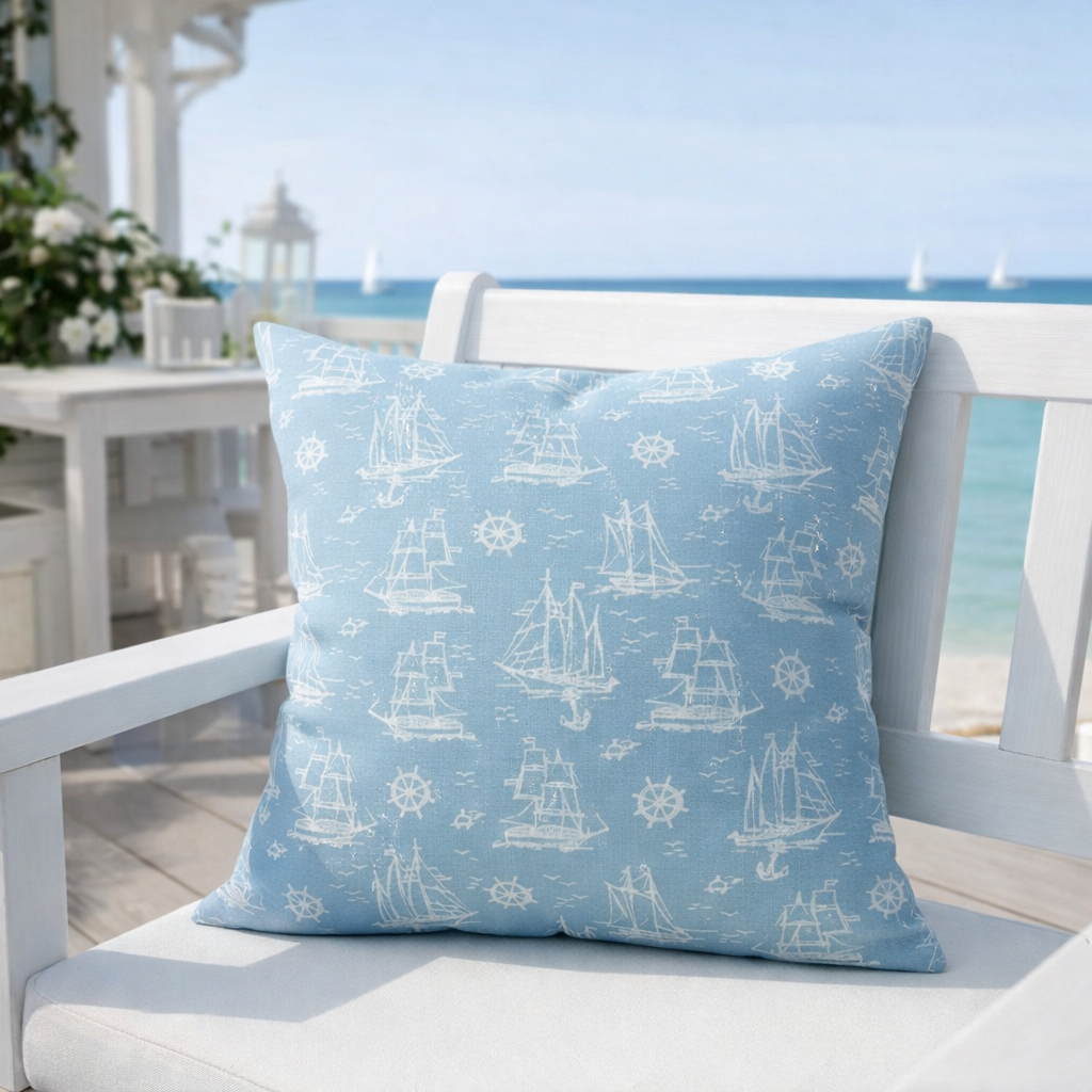 Декоративни калъфки създават усещане за бягство към морето, без да напускате дома си. Фините рисунки на кораби и морски символи върху деликатен син фон носят лекота и спокойствие, докато цялостното излъчване запазва топлината и непретенциозния чар на рустик стила. Това е баланс между природната простота и свежестта на крайбрежния живот.