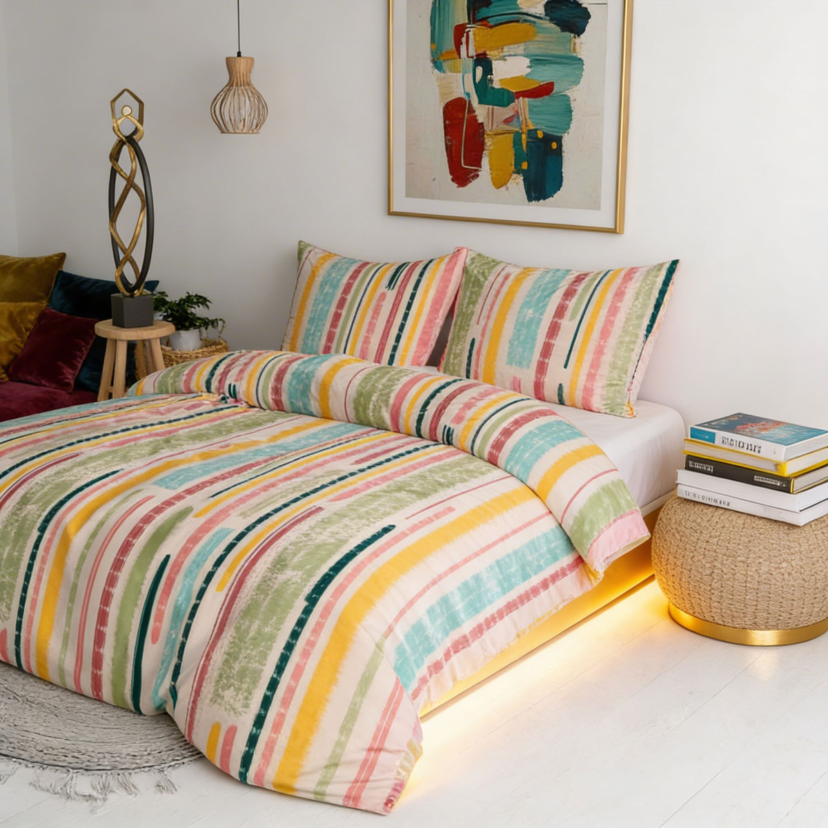 Свеж, артистичен и зареждащ с добро настроение – този спален комплект от ранфорс превръща всяка спалня в пространство с характер. Цветните линии създават усещане за движение и баланс, без да натоварват интериора.