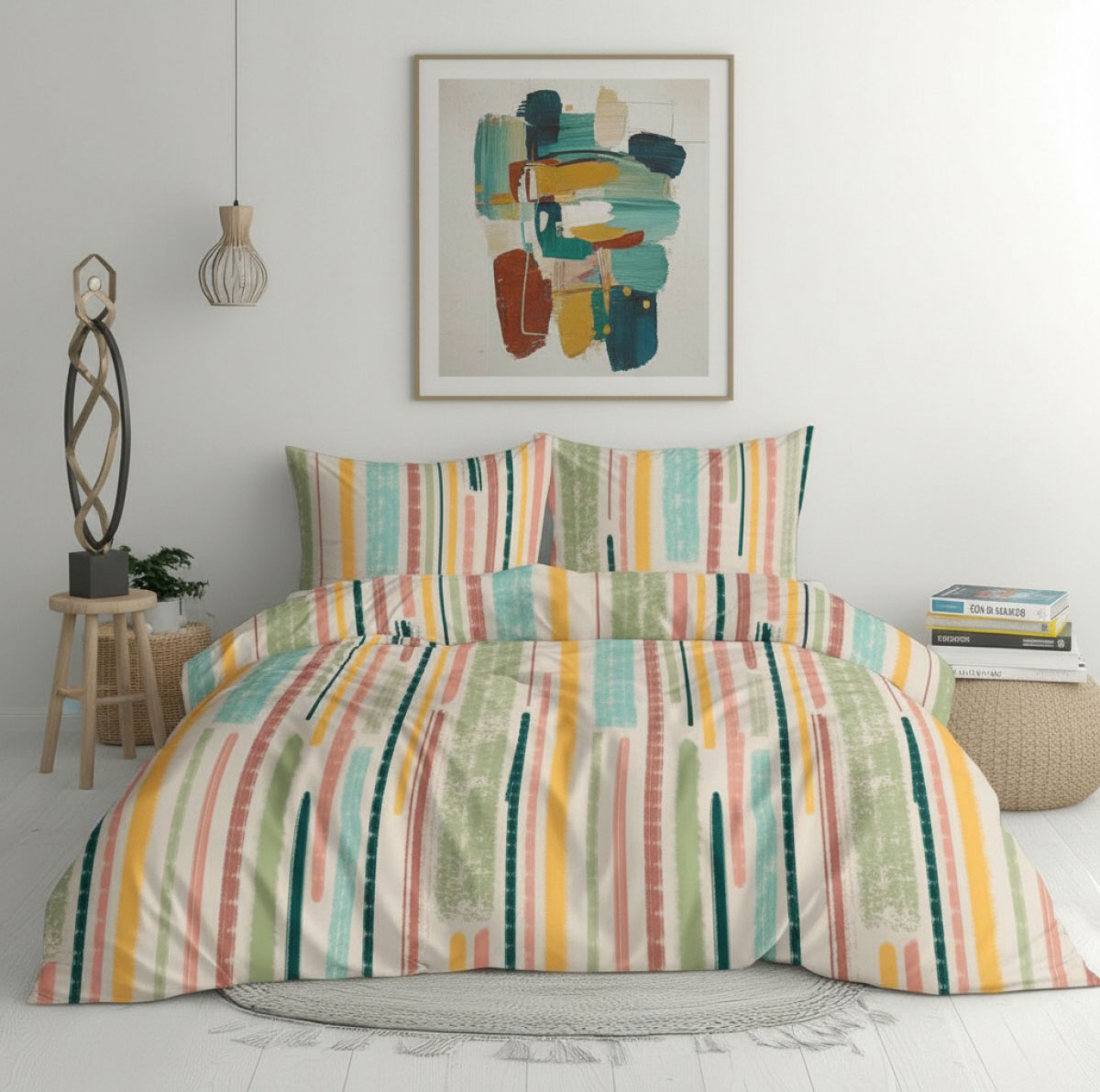 Този спален комплект просто обличат леглото и променя атмосферата в цялото помещение. Десенът от артистично разположени цветни линии носи лекота и динамика - прекрасен баланс между излъчване и домашен уют.