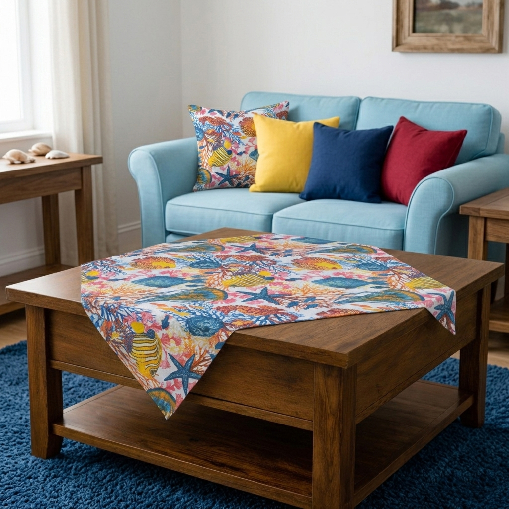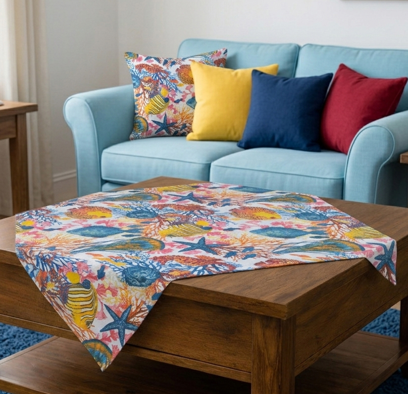 Това каре за маса с морски мотиви носи усещане за лято, свобода и лекота – като ден край морето, уловен в текстил. Богатият десен с корали, миди и морски звезди създава визуален ритъм, който привлича вниманието, без да натоварва пространството. Цветовете – наситено синьо, топло жълто, коралово и нежни пясъчни нюанси – внасят енергия и свежест, които оживяват всяка маса.