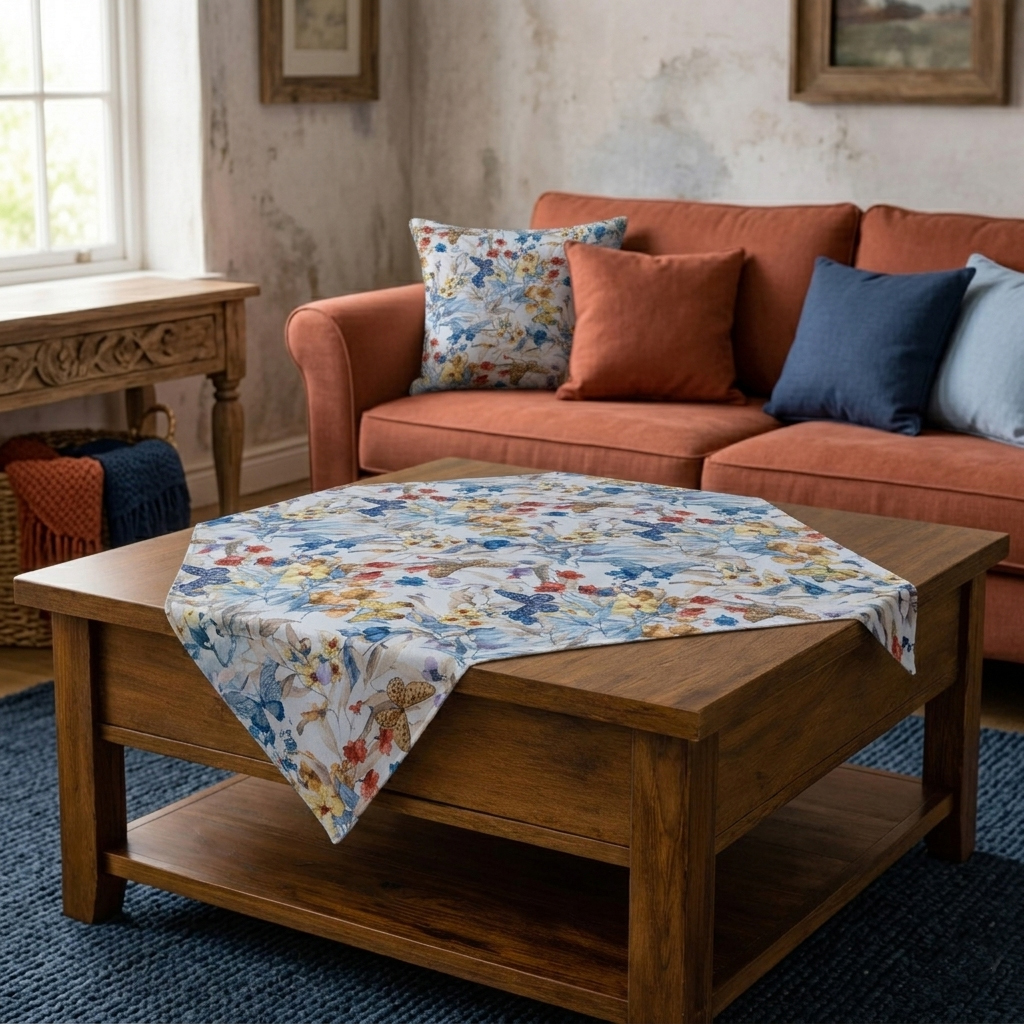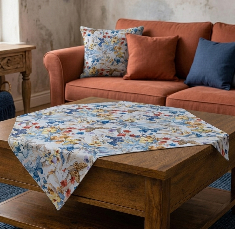 Това каре за маса привлича с нежна, акварелна композиция, в която цветя, листа и пеперуди се преплитат в лек и хармоничен ритъм. Цветовата палитра съчетава сини нюанси, топли пясъчни тонове, приглушено коралово и натурално бежово — комбинация, която носи усещане за въздух, светлина и сезонна лекота.