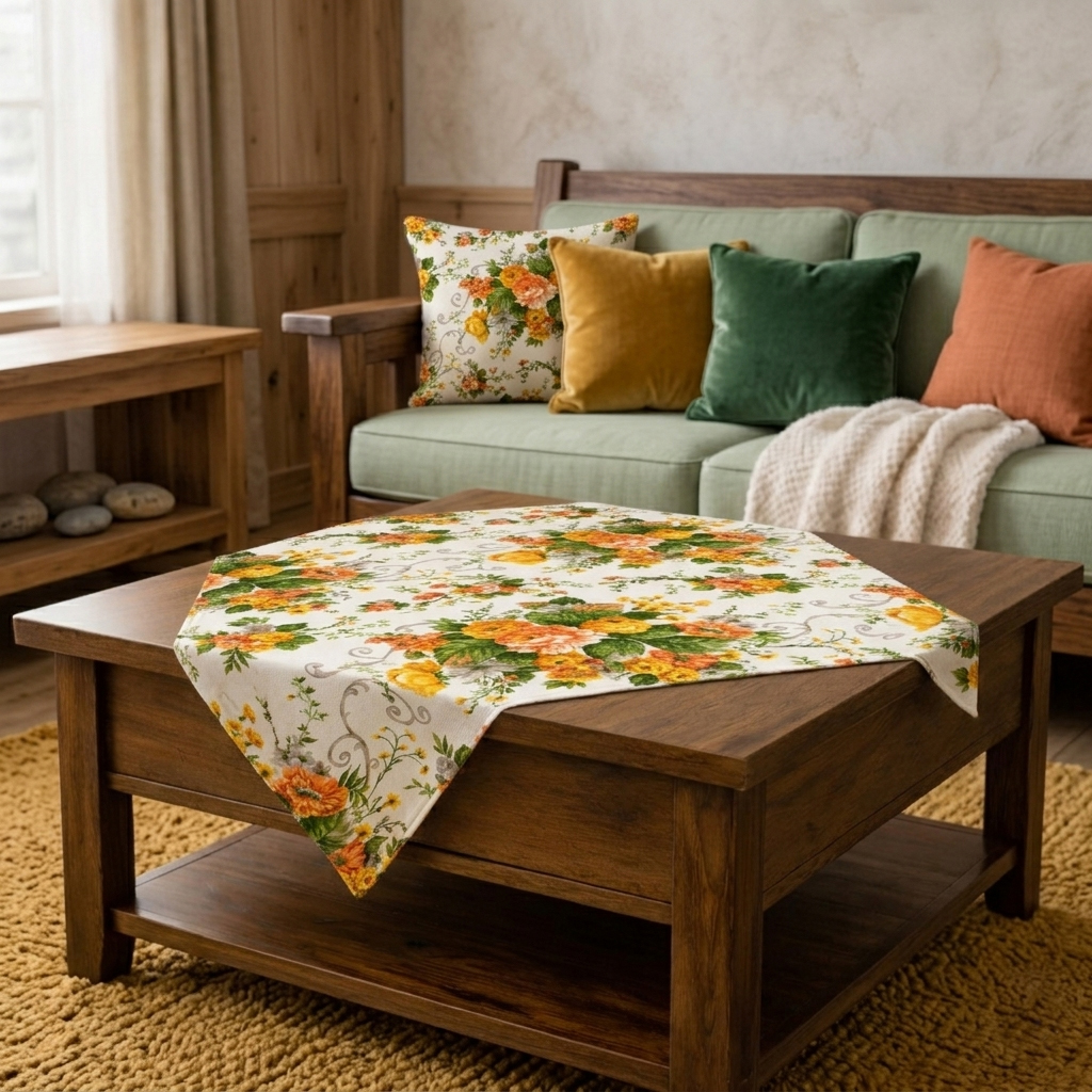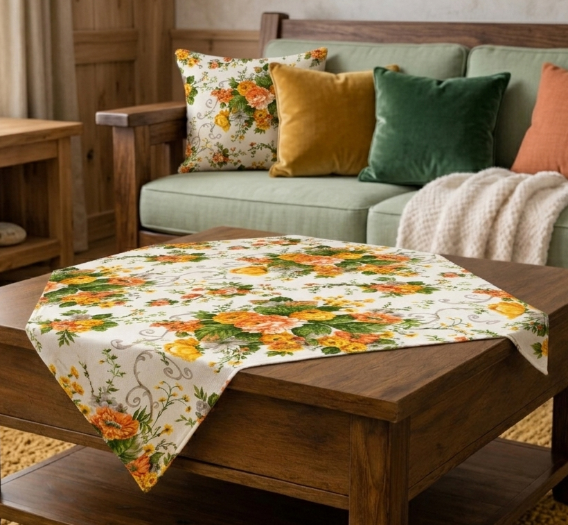 Това каре за маса е с топъл десен, който съчетава жълто-оранжеви цветя, зелени листа и мека светла основа в една хармонична, жива композиция. Излъчването му е слънчево и спокойно едновременно – достатъчно свежо, за да оживи пространството, и достатъчно балансирано, за да остане елегантен акцент.