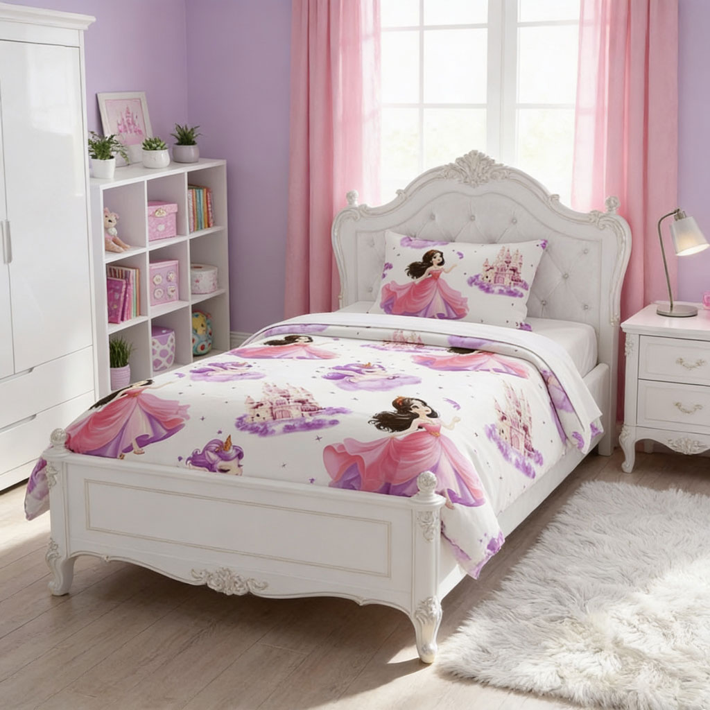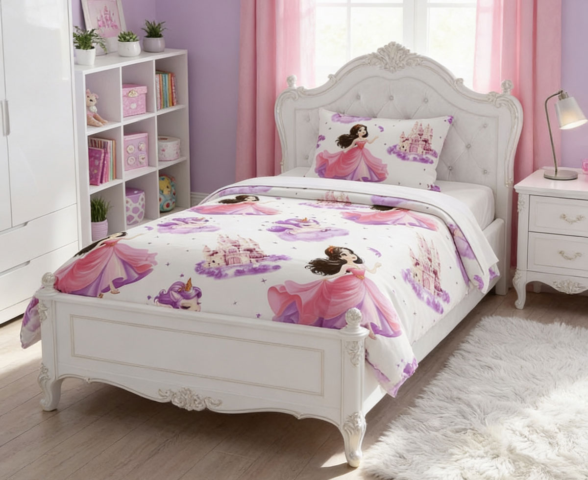 „Приказен бал“ е памучен спален комплект, създаден да вдъхновява мечти. Деликатният десен с ефирни принцеси, вълшебни замъци и фини лилаво-розови акценти превръща всяка детска стая в сцена от любима приказка. Това е избор за пространство, в което въображението има свободата да разказва истории всяка вечер.
