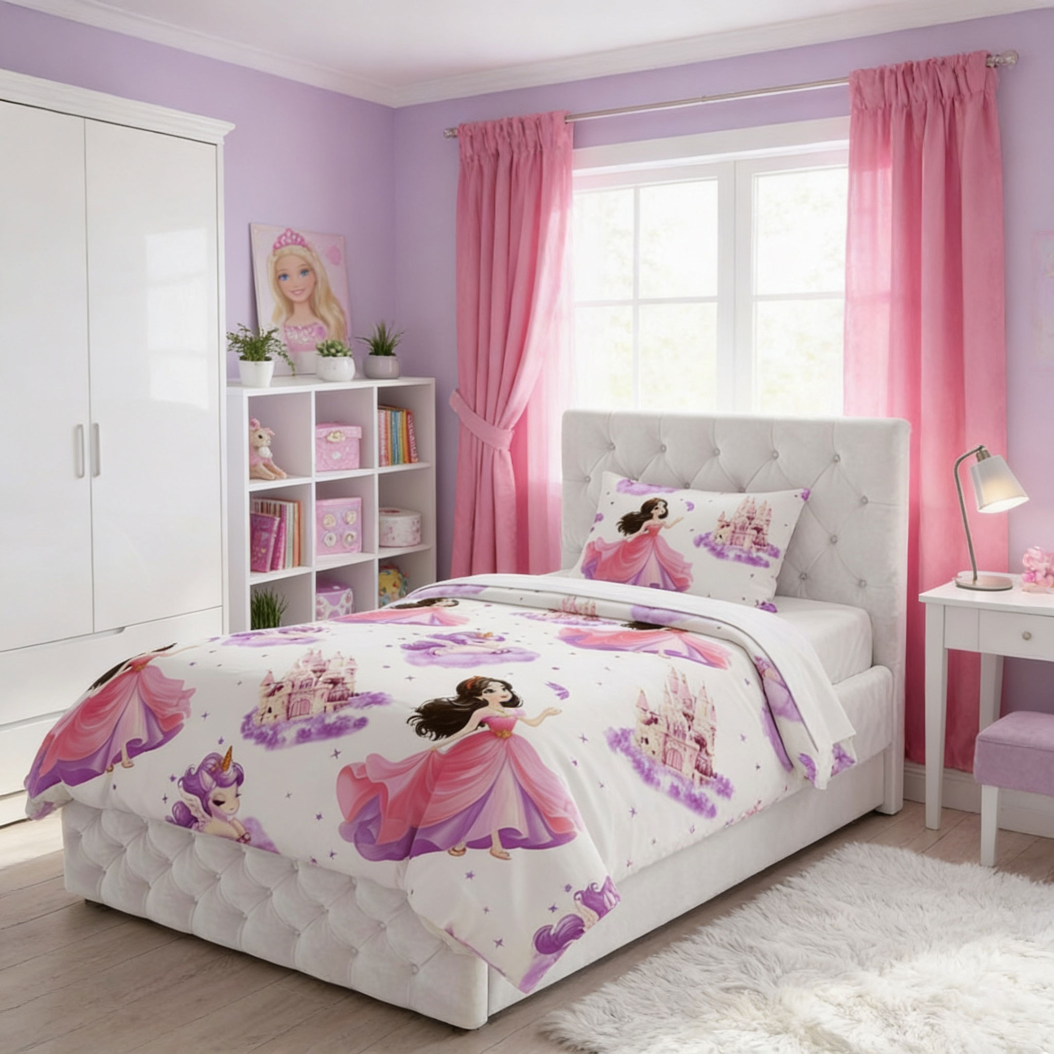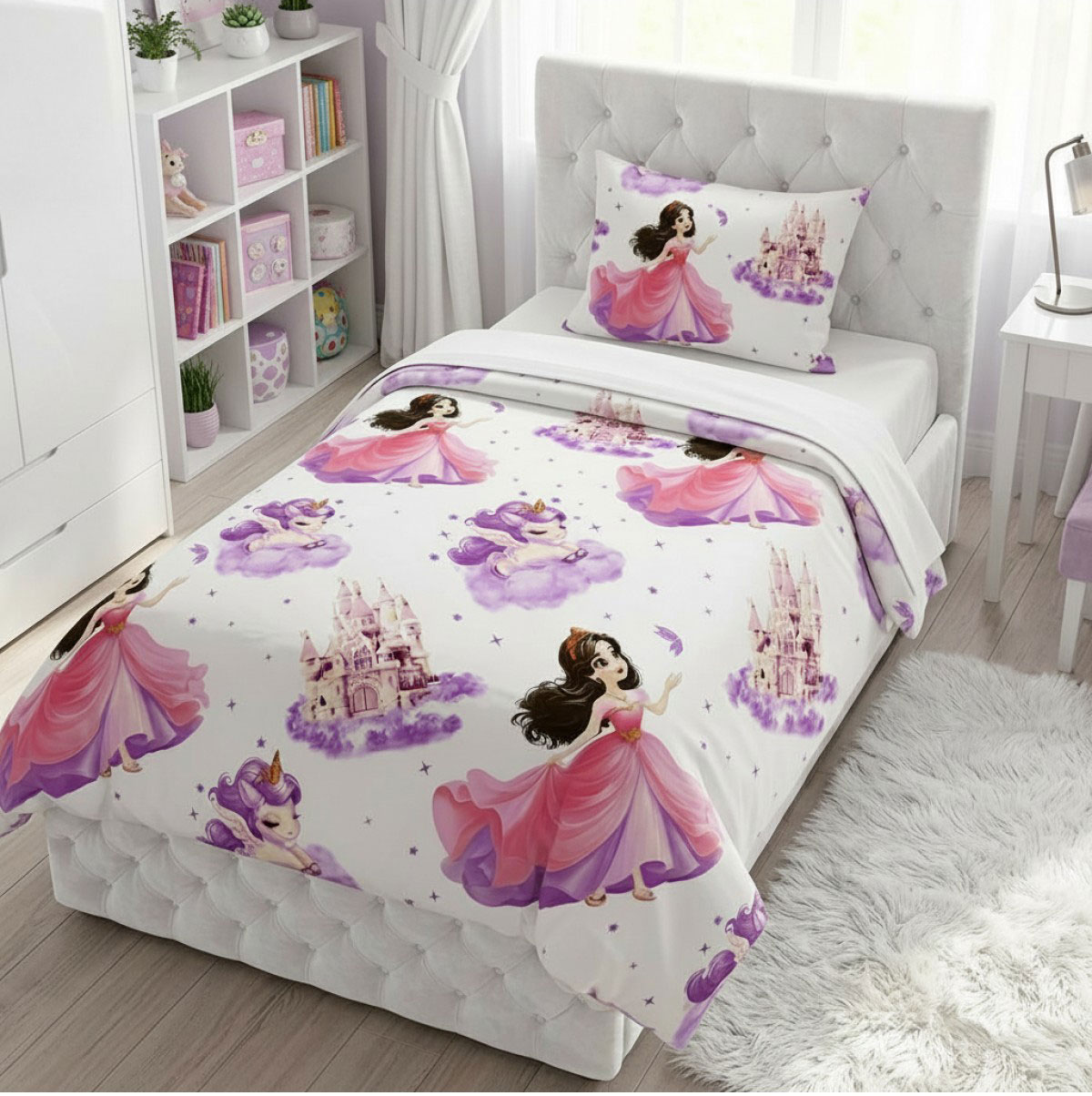 Комплектът се предлага в различни размери и конфигурации, което го прави практичен избор за всяко детско легло. Долният чаршаф в розов или лилав нюанс допълва визията и създава хармонична цветова среда.