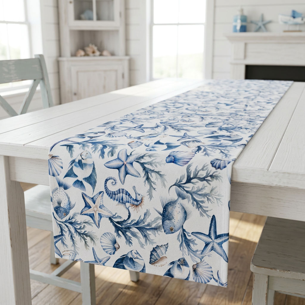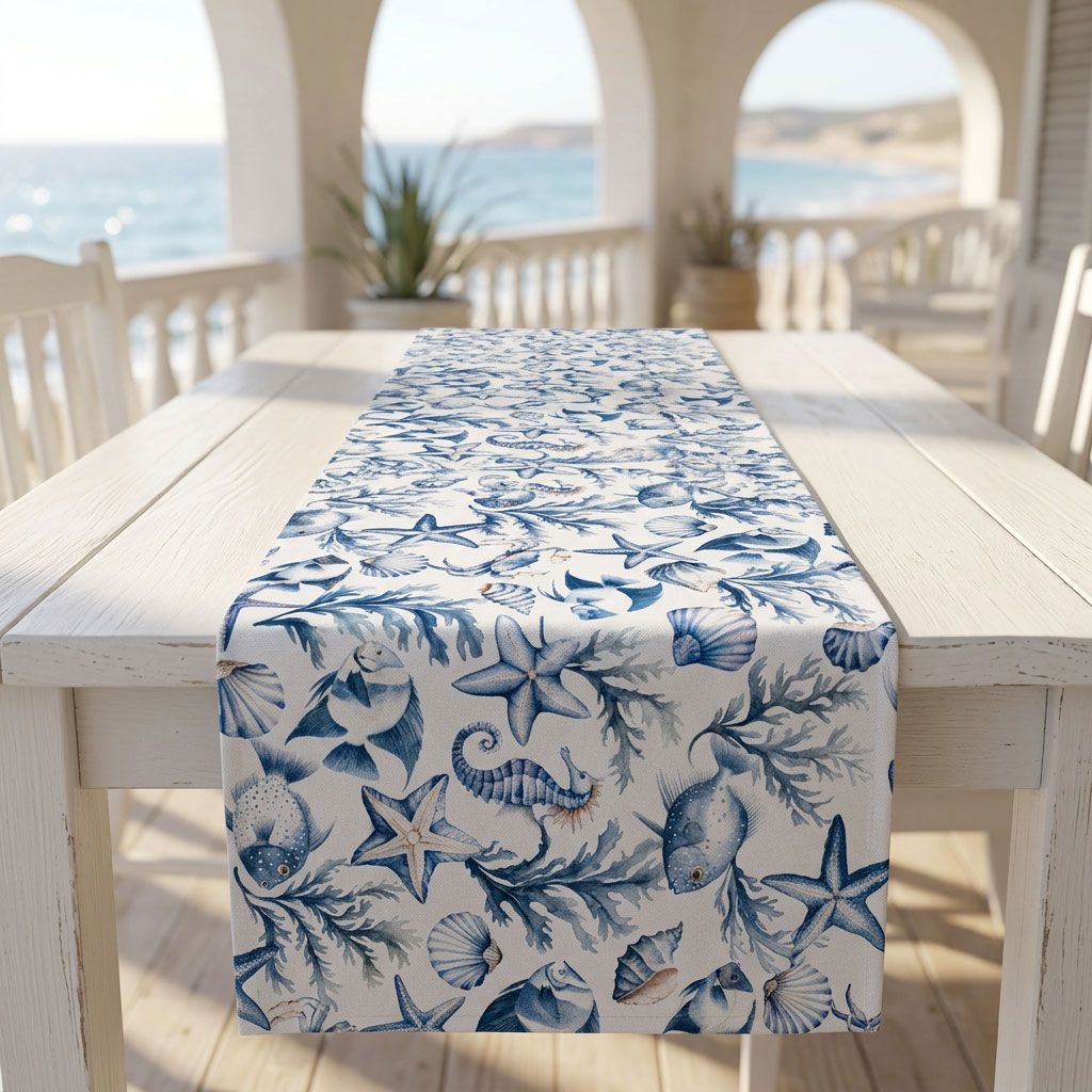 Тишлайфер за маса „Син морски свят“ е създаден за интериори, които търсят баланс между спокойствие, характер и фино декоративно присъствие. Дизайнът в бяло и синьо е вдъхновен от морето и съчетава деликатни илюстрации на морски звезди, раковини, корали, риби и морски кончета. Така тишлайферът превръща обикновената маса в стилен акцент с ясно изразена атмосфера.