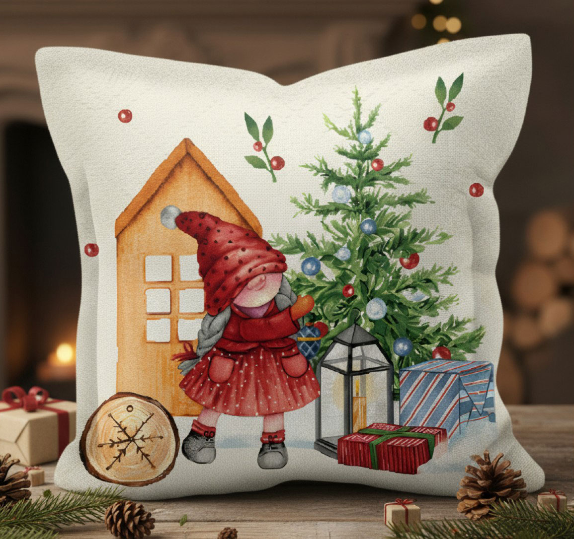 Този модел декоративна калъфка за възглавница е изработен от висококачествен плат, с естествени цветове и коледни елементи - подаръци, снежинки и играчки за елха.