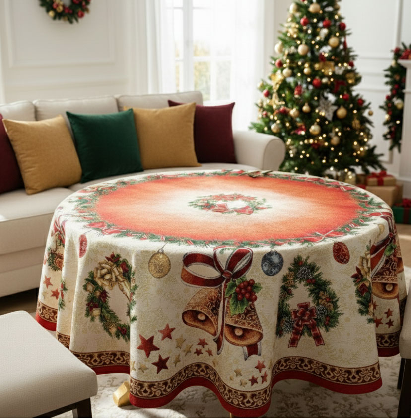 Нова Коледна покривка за кръгла маса може да подарите на своето семейство.