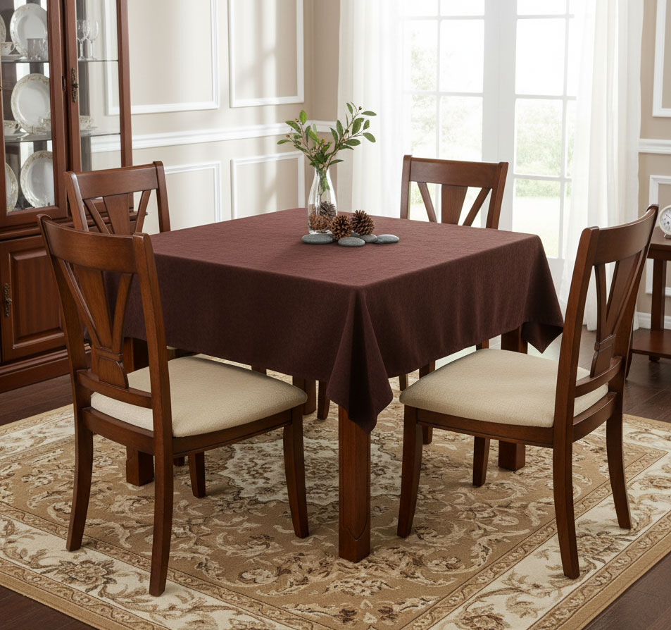 Тъмнокафява покривна за маса. Размерите на покривката да 275х275 см. Цветът е актуален за всички годишни времена. Съчетайте с каре или тишлайфер с ярки цветове. За есенните цветове коментар не е нужен! Те са класика.
