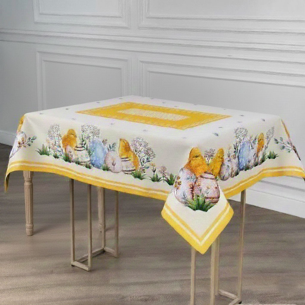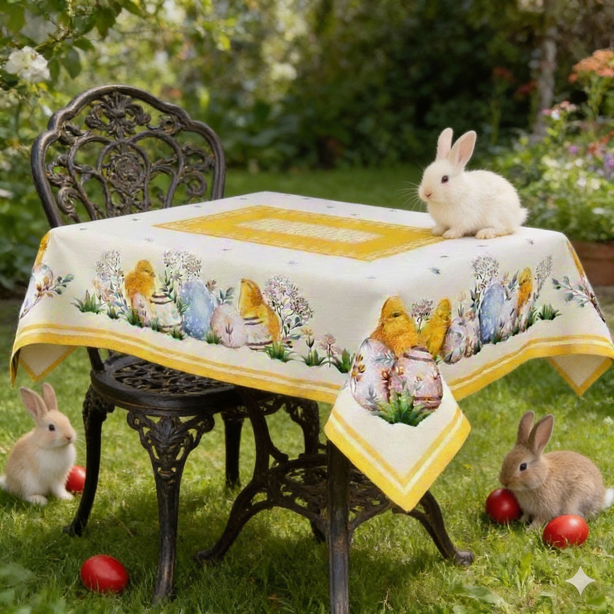 Великденската покривка е подходяща за сервиране - чудесно се съчетава с едноцветни - червени, сини и зелени салфетки и хенгъли. Подходяща е за декорация.