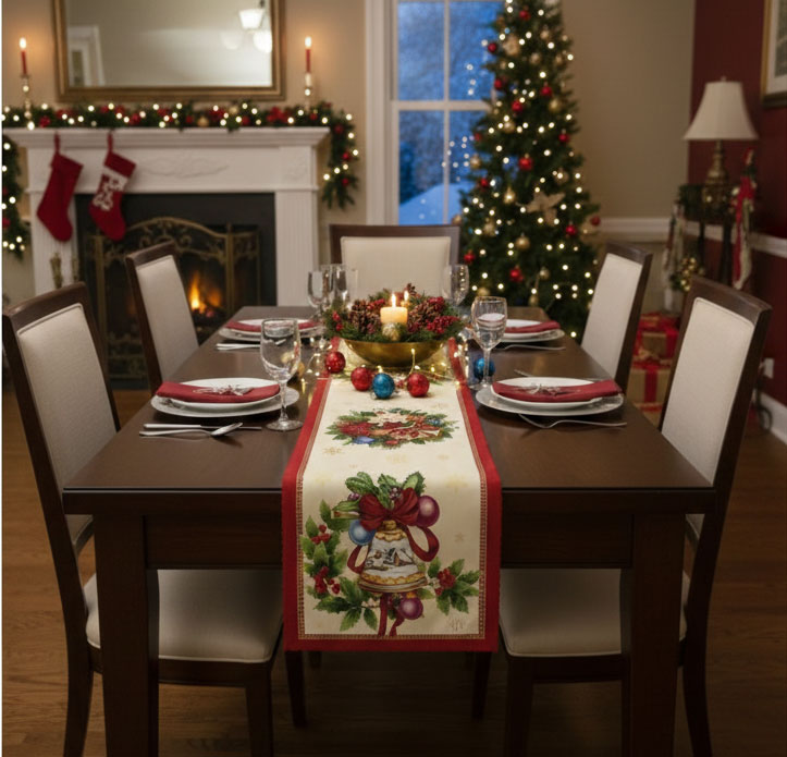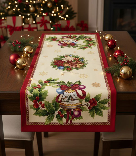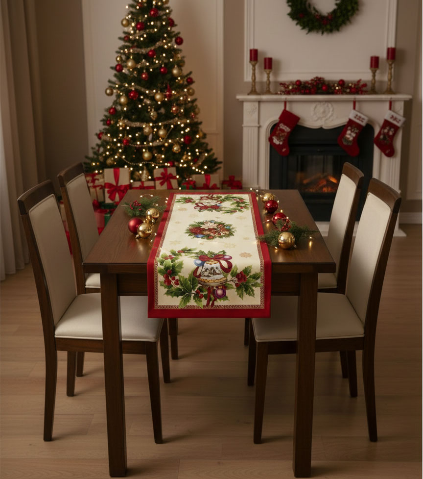 Разкошен коледен тишлайфер, подходящ за наредба у дома - за малка и голяма маса. Използва се често за заведения, които държат на качеството на интериорните решения. Изработен е от тежък жакардов плат, памук и полиестер.