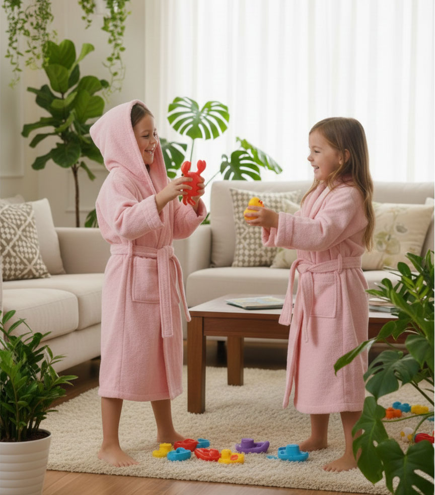 Пухкаво розово детско халатче за момиченца. Предназначен за попиване на влагата от детското тяло след баня. Детско халатче, ушито от плътен хавлиен плат.