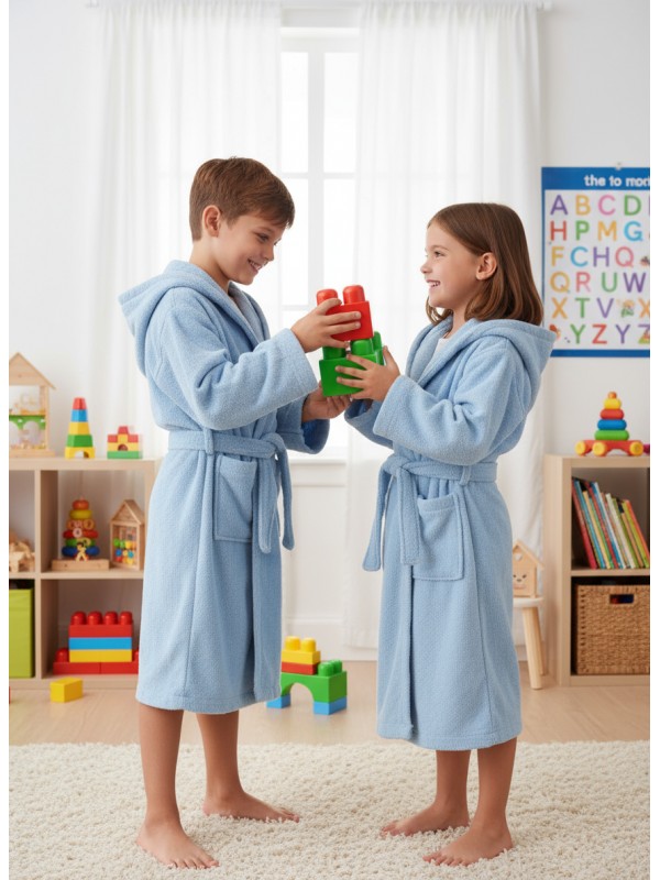 Предлаганото детско халатче е ушито от плътен хавлиен плат.
