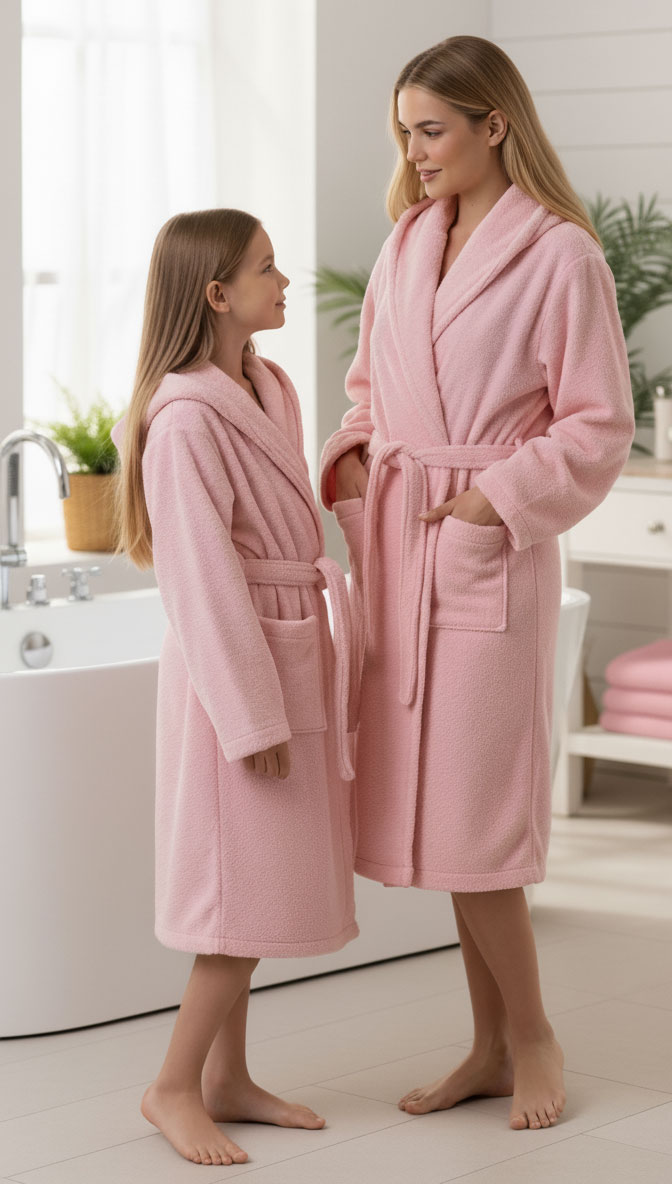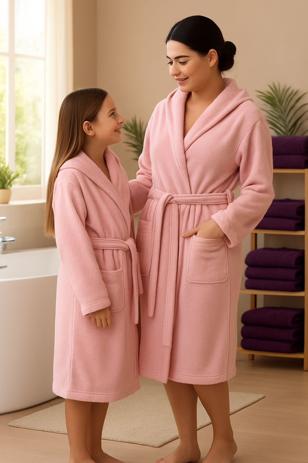 Пухкав розов дамски халат от памучна материя с висока абсорбираща способност.