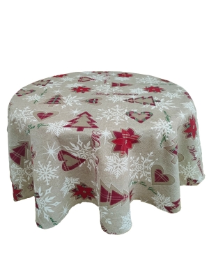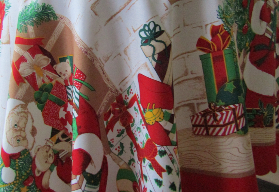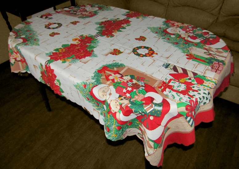Весела украса за Коледа и Нова година - коледна покривка за маса, подходяща и за детско парти. Покривката е лесна за поддръжка - удобна е за детски градини, заведения и детски клубове. Разкошни едри образи на Дядо Коледа с подаръци и мили мечета. Класически цветове.