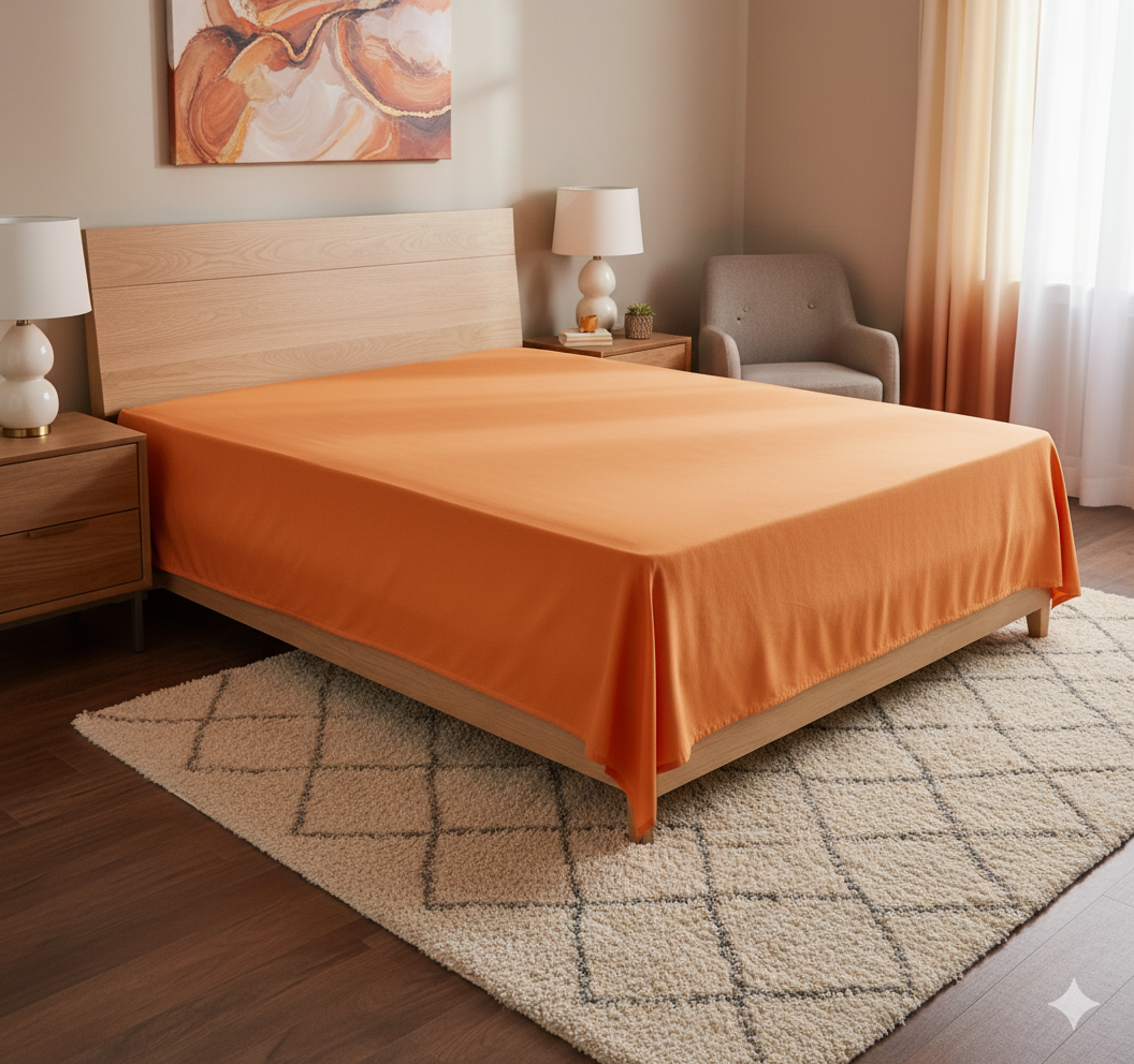 Памучен долен чаршаф, ушит от ранфорс. Цветът е оранжев. Размерите са за голяма спалня 240х260 см. Налични са ограничени количества.
