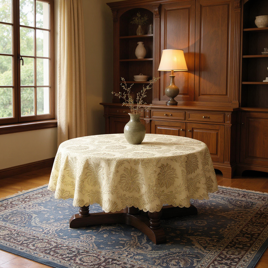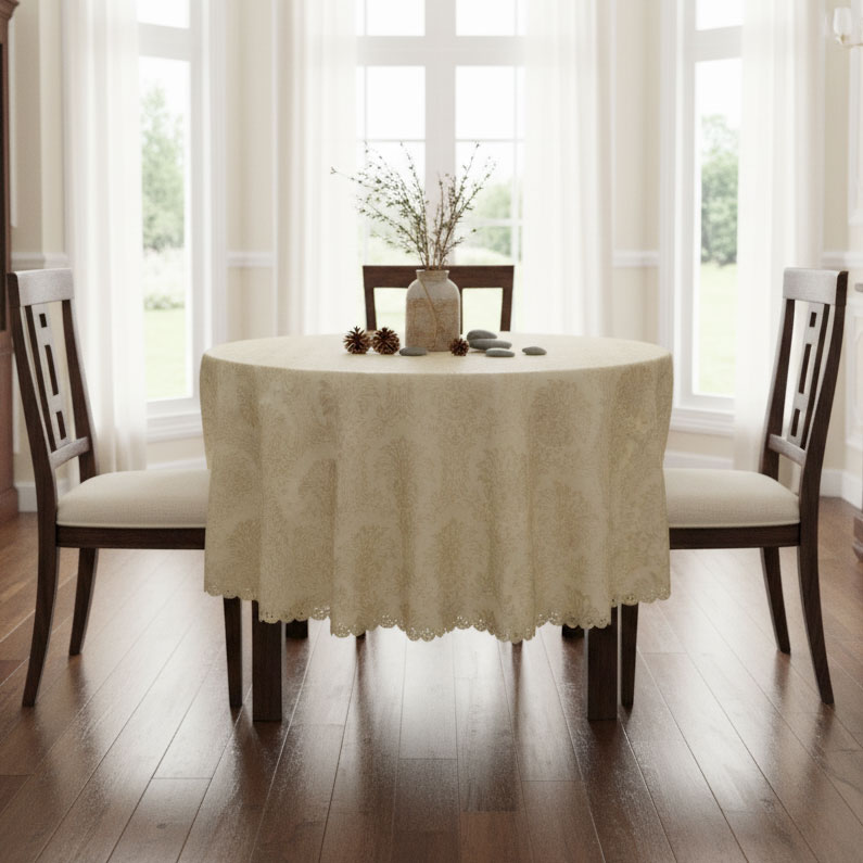 Предлаганите покривки за маса цвят екрю са подходящи както за ежедневна употреба, така и за тържествено сервиране. Вашата трапезарията се превръща в гостна на дворец с тази рококо красота, с подходящ сервиз и прибори.
