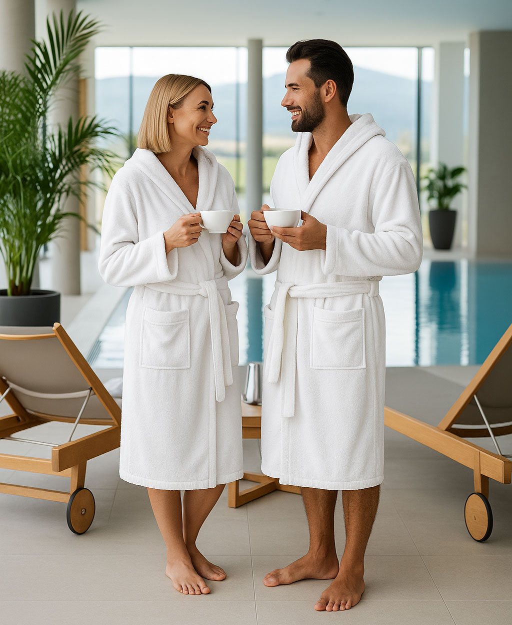 Пухкав и плътен бял халат за баня с колан. Предлага се във вариант с качулка и с шал яка. Халатът с качулка е предстаавен като отделен артикул в онлайн магазина.